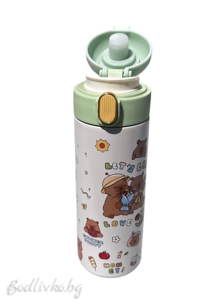 Основни характеристики: * Двойностенна вакуумна изолация за поддържане на температурата. * Неръждаема стомана 304 - безопасна и издръжлива. * Дизайн, подходящ за деца с удобна сламка. * Атрактивен дизайн с капибара. * Лесна за почистване.
