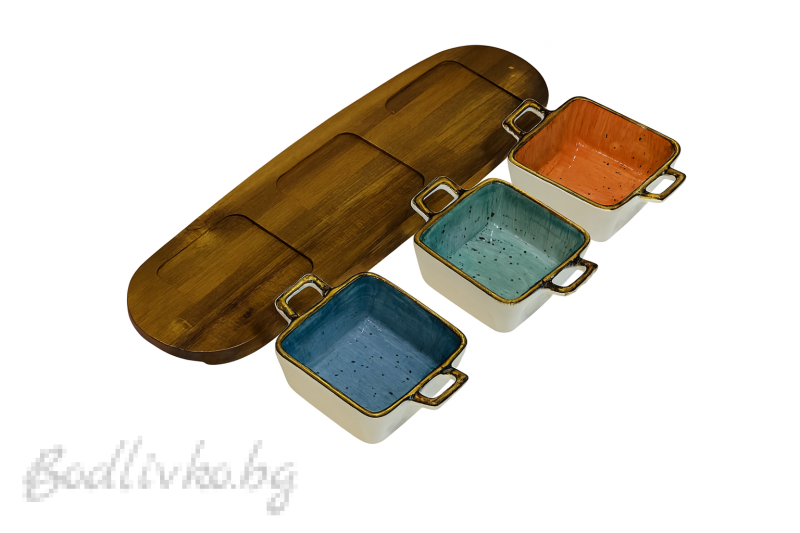 Този комплект е идеален за сервиране на различни видове предястия, сосове, дипове, ядки, плодове и други малки хапки. Можете да го използвате както за ежедневна употреба, така и за специални поводи и гости. Комбинацията от керамични купички и дървена табличка придава стил и изтънченост на всяка маса.