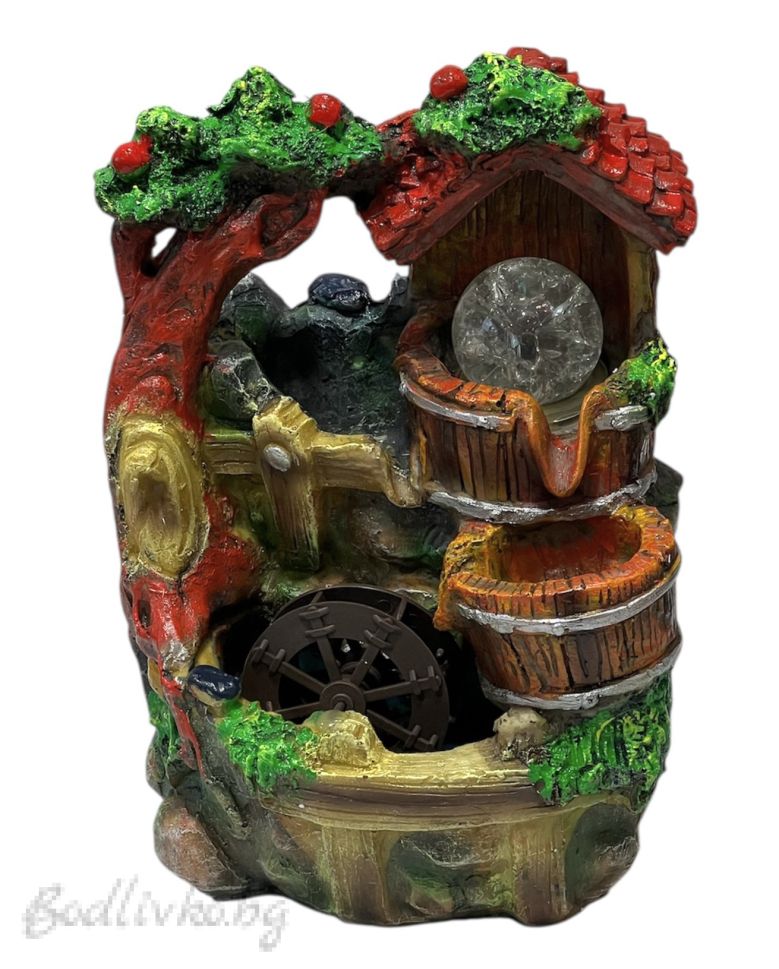 Пренесете очарованието на природата и тихия шепот на водата във вашия дом с нашия декоративен фонтан "Къщичка с Водно Колело". Този изящен фонтан е не само красив аксесоар, но и източник на релаксация и спокойствие, превръщайки всяко пространство в оазис на хармония.