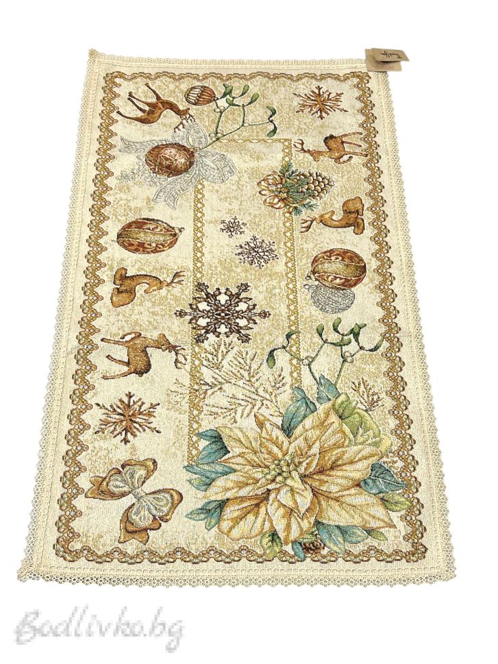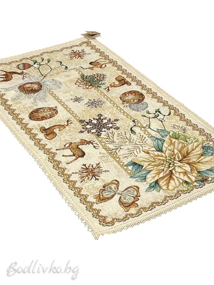 КОЛЕДЕН ЖАКАРДОВ ТИШЛАЙФЕР С ДАНТЕЛА, ЗЛАТНИ ЕЛЕНИ 40/70 СМ.