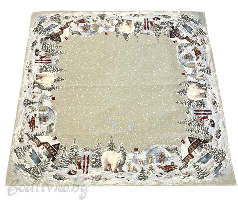 Всяка страна на този квадратен шал е украсена с очарователна зимна сцена. Представете си снежни пейзажи, къщички, покрити със сняг, и величествени бели мечки, които се разхождат из зимната гора. Фините детайли и богатата текстура на жакардовата тъкан правят този шал истинско произведение на изкуството.