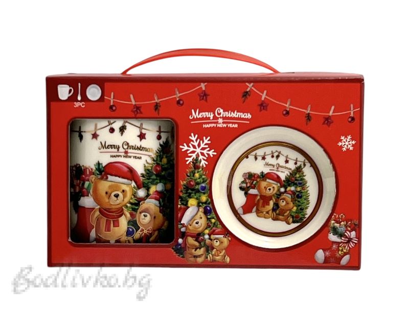 - Коледен комплект от 3 части: чаша, чинийка и лъжичка