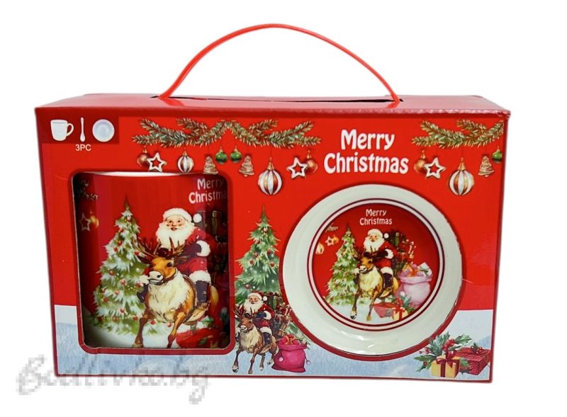 - Коледен комплект от 3 части: чаша, чинийка и лъжичка