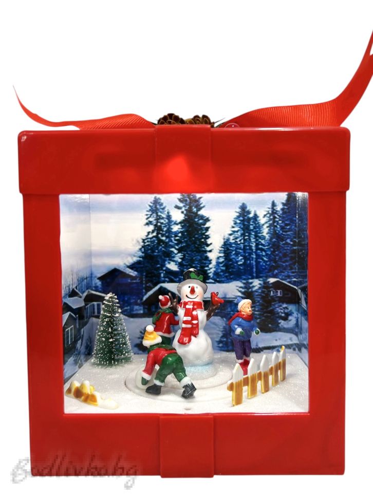 Кутията е проектирана да наподобява подарък, украсен с панделка, което я прави идеалното допълнение към вашата коледна украса. Вътрешността на кутията разкрива живописна сцена със зимни пейзажи и усмихнати снежни човеци.