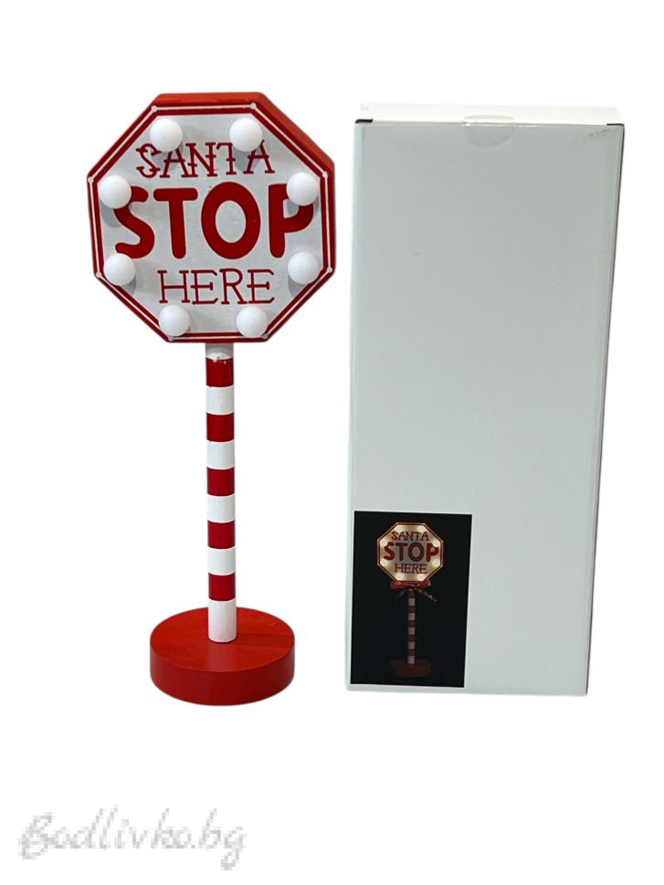 * Височина: 30 см * Светеща табела с надпис "SANTA STOP HERE" * Захранване: батерии (не са включени) * Материал: Висококачествени материали * Дизайн: Ярък и привлекателен дизайн в коледни цветовеПерфектен подарък за всеки, който обича Коледа и иска да украси дома си с уникални и празнични аксесоари. Тази светеща табела е не само красива, но и функционална, осветявайки вашия дом с мека и топла светлина.