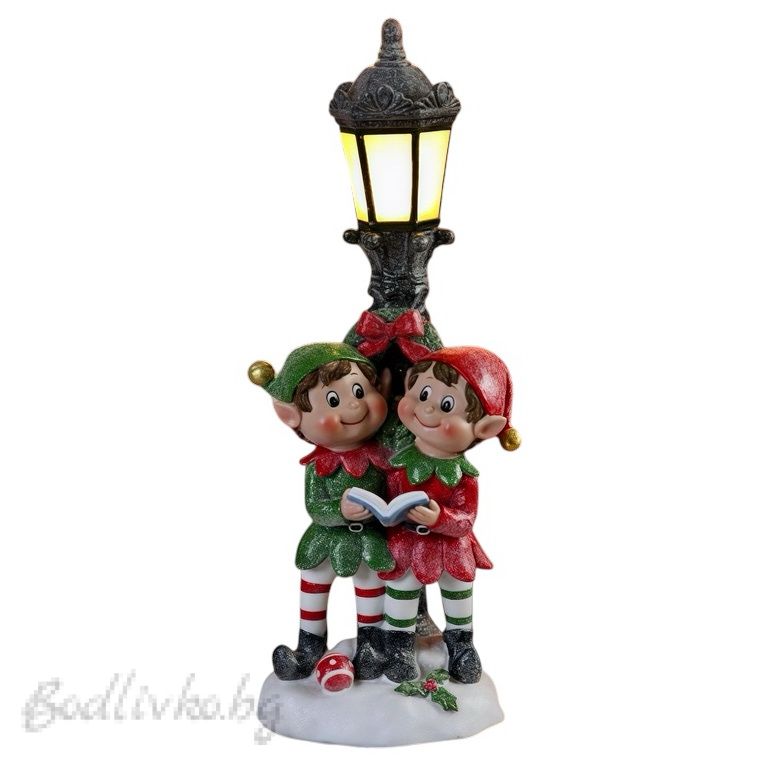 Фигурката представлява два мили елфа, сгушени под светещ уличен фар, докато четат книга с приказки. Детайлите са изпипани до съвършенство, от малките червени и зелени костюми на елфите до реалистичния дизайн на фара.