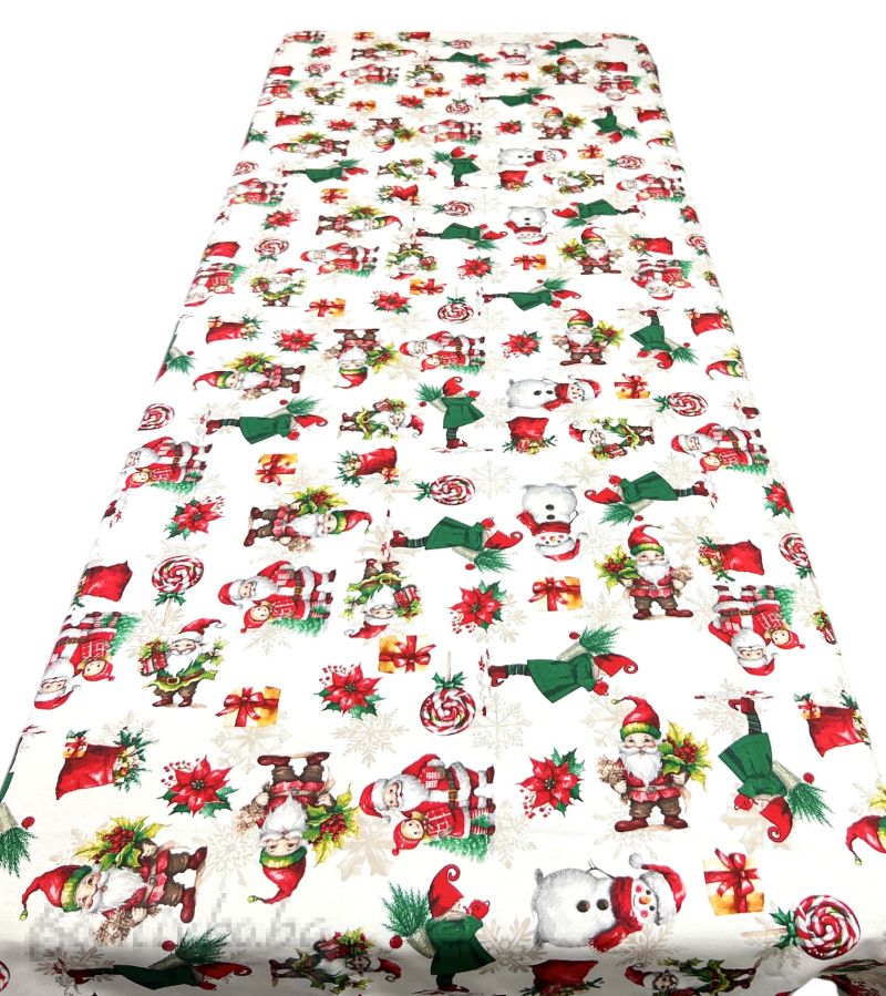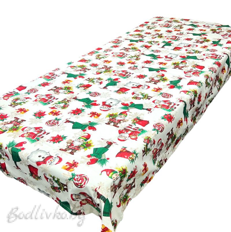 Покривката е украсена с очарователни изображения на джуджета, снежни човеци, коледни цветя и подаръци, които ще зарадват както малки, така и големи. Цветовете са ярки и наситени, което придава празничен вид на вашата маса.