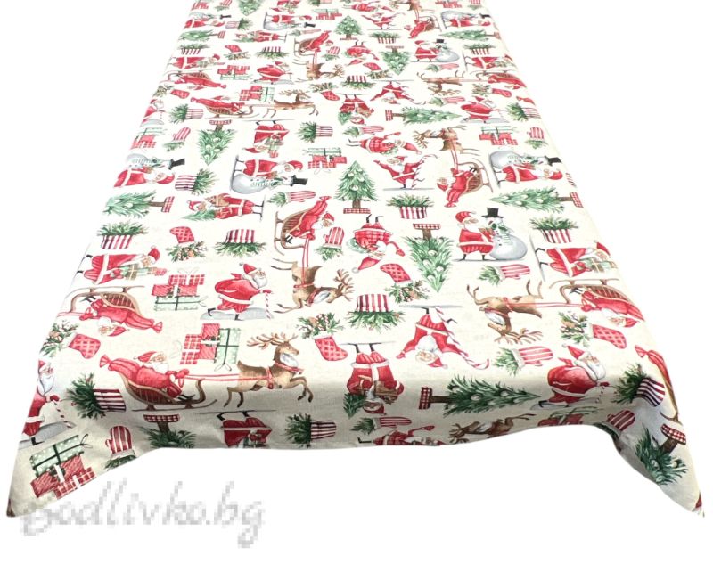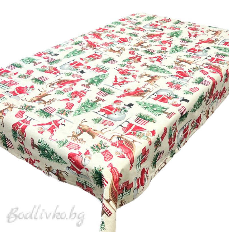 Покривката е декорирана с очарователни илюстрации на Дядо Коледа, усмихнати снежни човеци, зелени коледни елхи, подаръци и елени - всички символи на Коледа, които създават топла и приветлива атмосфера. Цветовете са ярки и наситени, което допринася за празничното настроение.