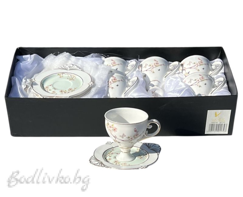 Елегантен порцеланов сервиз за кафе с нежни цветя.