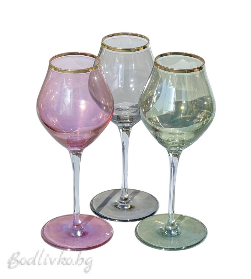 Уникален дизайн и цветове: Всяка чаша е индивидуално оцветена, предлагайки палитра от нежни и атрактивни нюанси. Златният кант добавя фин завършек и допълнително подчертава изискания им вид.