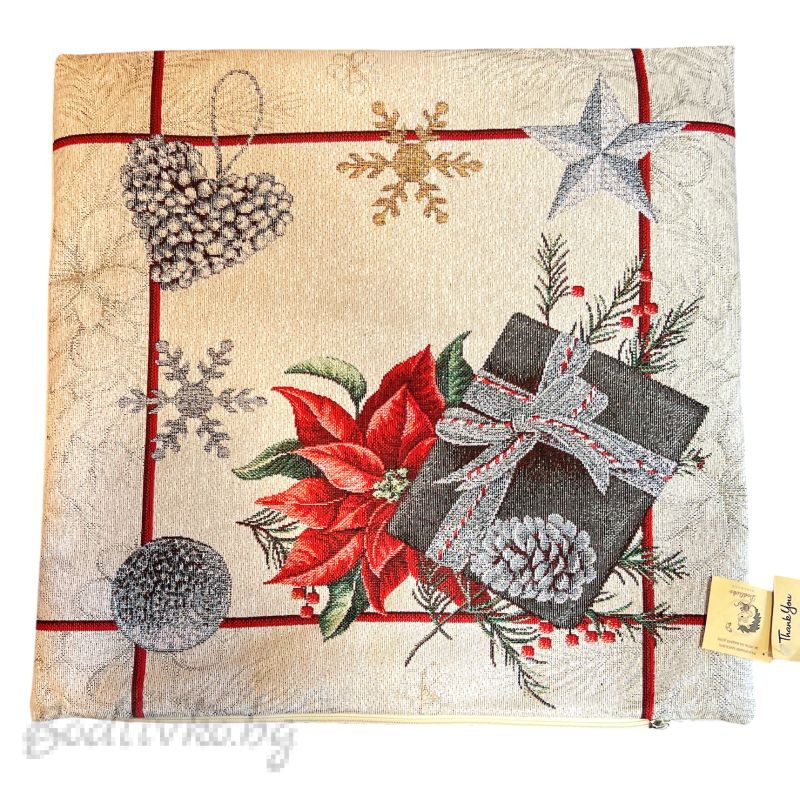 Калъфката е изработена от висококачествен текстил, който осигурява мекота и комфорт. Изображението включва коледна звезда, подарък, снежинки, сърце и коледна топка. Тези мотиви са перфектно съчетани, за да създадат топла и уютна атмосфера във вашия дом.