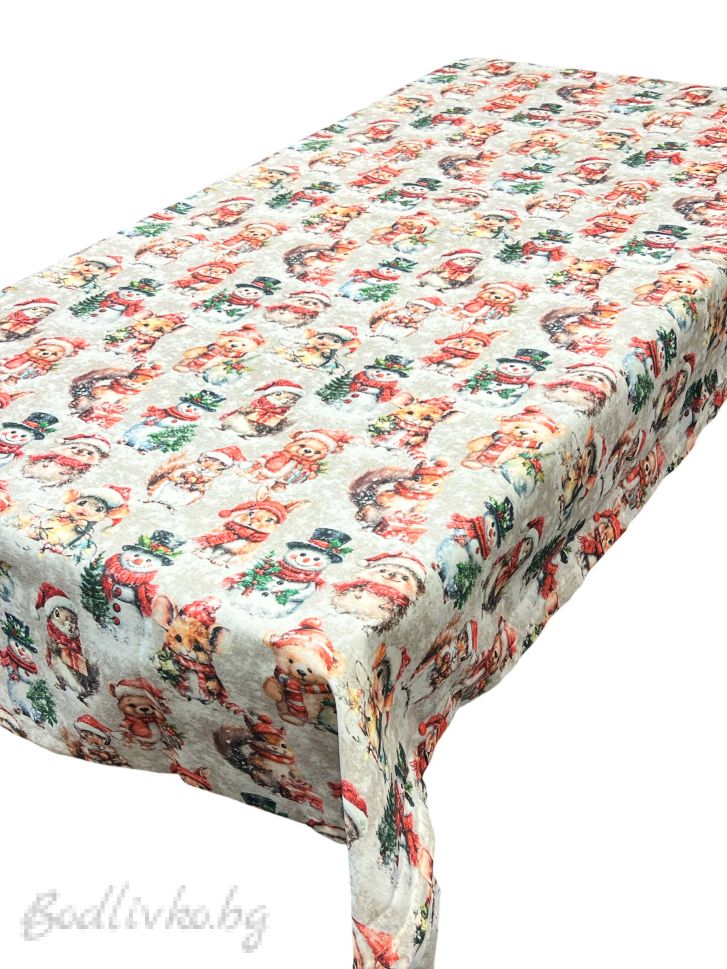 Празничен дизайн: Покривката включва очарователен дизайн на снежен човек, заобиколен от очарователни животни, създавайки топла и приветлива атмосфера.