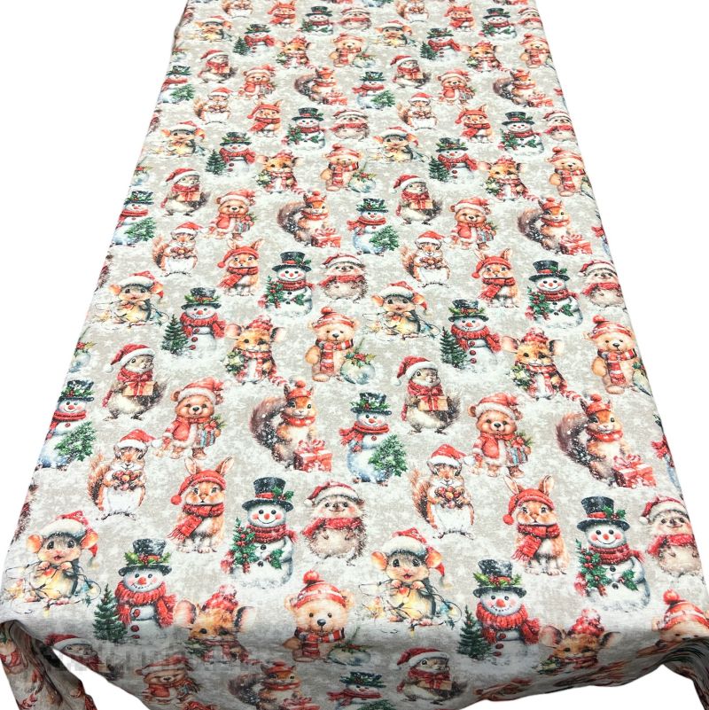 Ето и описанието на коледната покривка за маса: Прегърнете духа на празника с нашата очарователна коледна покривка за маса, украсена със закачлив дизайн на снежен човек с животни!
