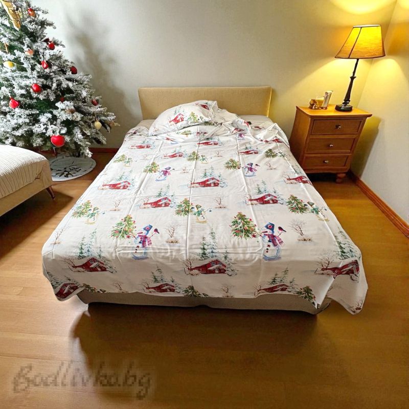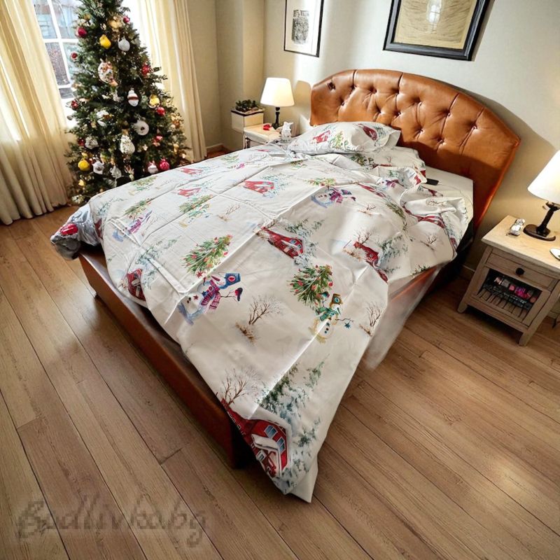 КОЛЕДЕН СПАЛЕН КОМПЛЕКТ "ЗИМНИ КЪЩИ", 100% ПАМУЧЕН САТЕН, 4 части