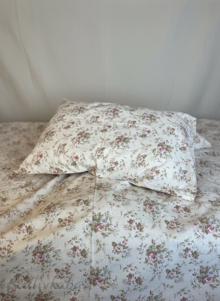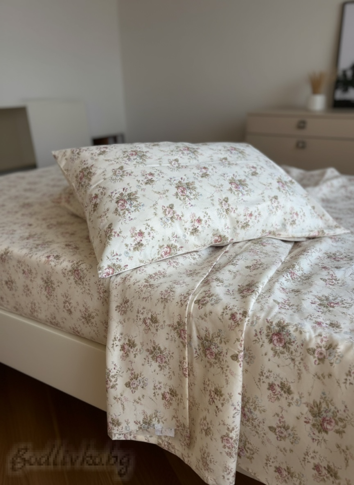СПАЛЕН КОМПЛЕКТ НЕЖНИ РОЗИ В ЕКРЮ, 100% натурален памук (ПОПЛИН), 4 части