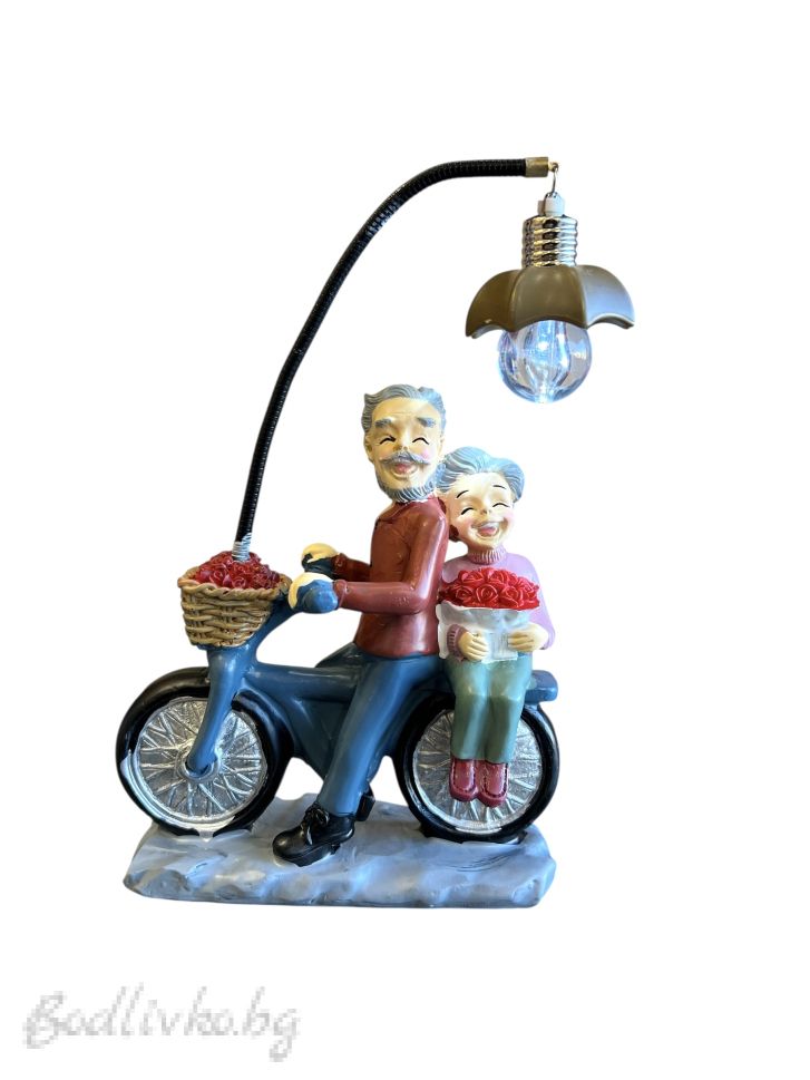 Фигурка баба и дядо на колело , светеща лампичка, 17см.