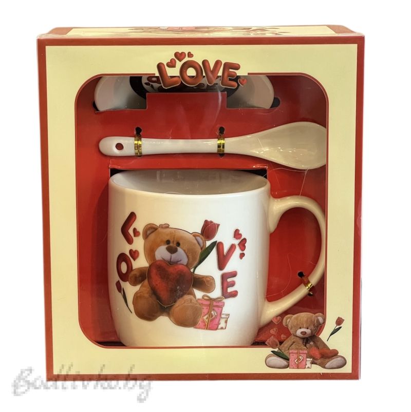 Чаша "Мече LOVE" с лъжичка и чинийка в кутийка - Перфектният подарък за любим човек!