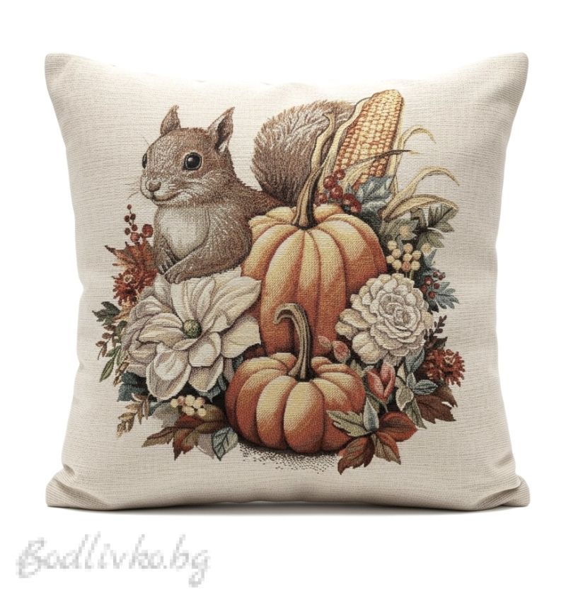 Преобразете вашето пространство с нашата очарователна калъфка за възглавничка "Катеричка с Тикви". Тази възглавничка, с размер 45/45см, е идеалният начин да добавите нотка есенна красота и уют във вашия дом.