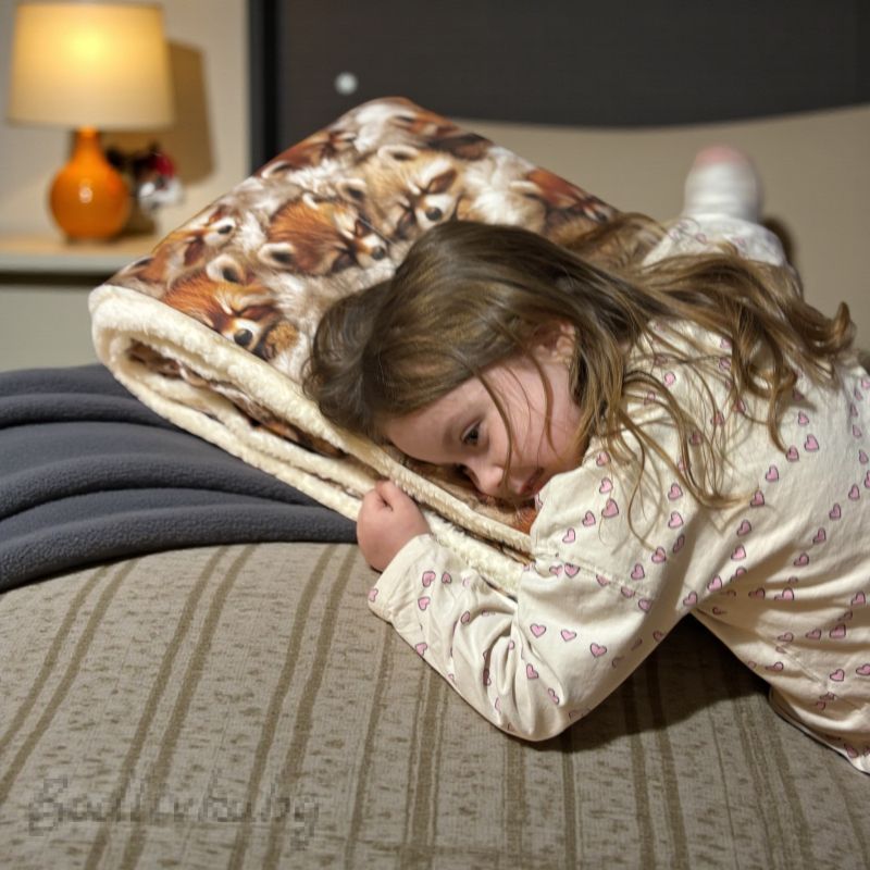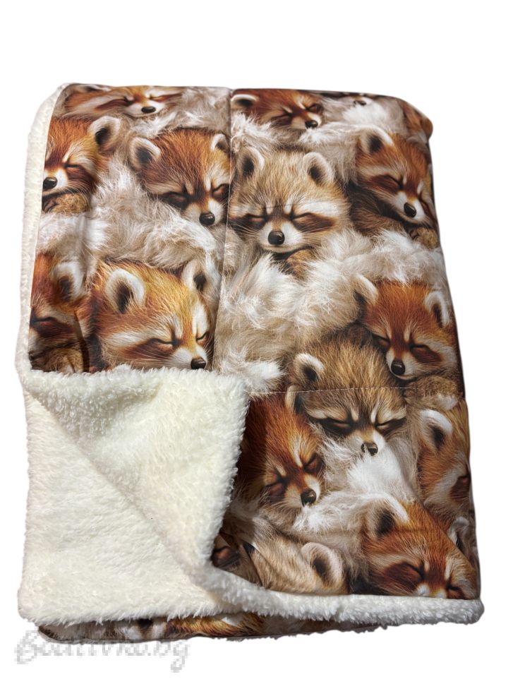 Одеялото е декорирано с очарователни илюстрации на спящи еноти, което го прави не само функционално, но и визуално привлекателно. Този дизайн ще добави нотка на игривост и уют към всяка стая.