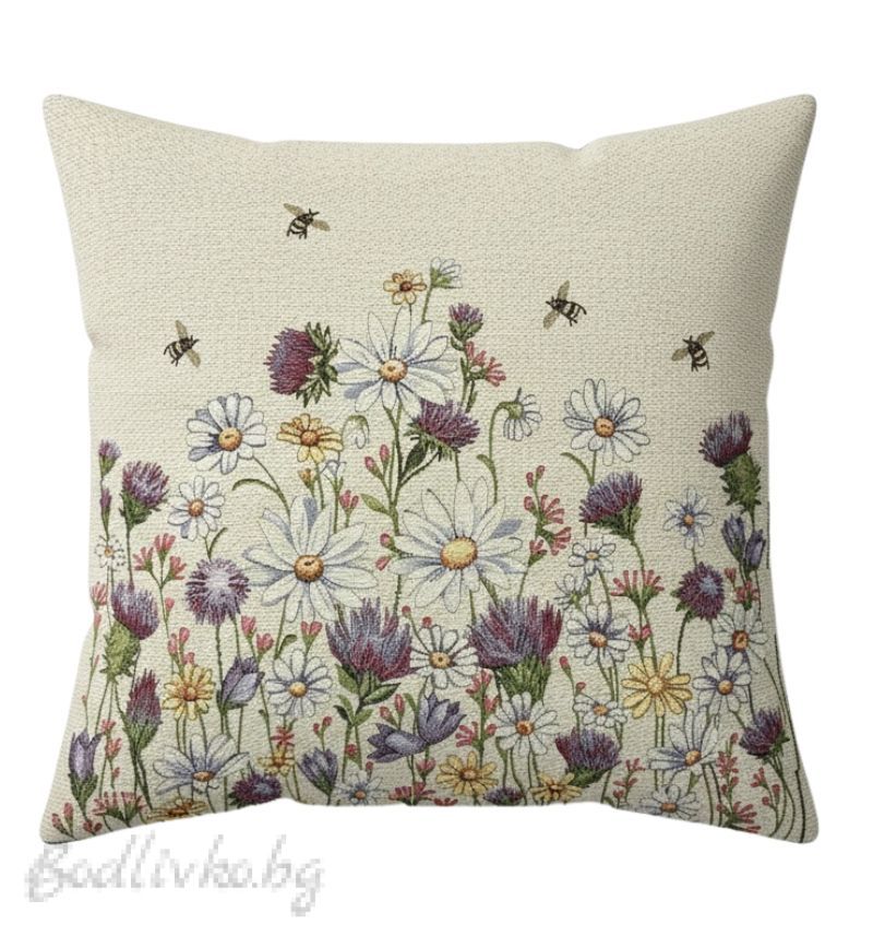 Калъфката е украсена с красива илюстрация на поляна, изпълнена с цветя и пчелички. Топлите и пастелни тонове внасят усещане за спокойствие и уют, превръщайки я в идеален аксесоар за всеки дом. Живите цветове и детайлните изображения на цветята и пчелите ще направят всяка стая по-приветлива и слънчева.