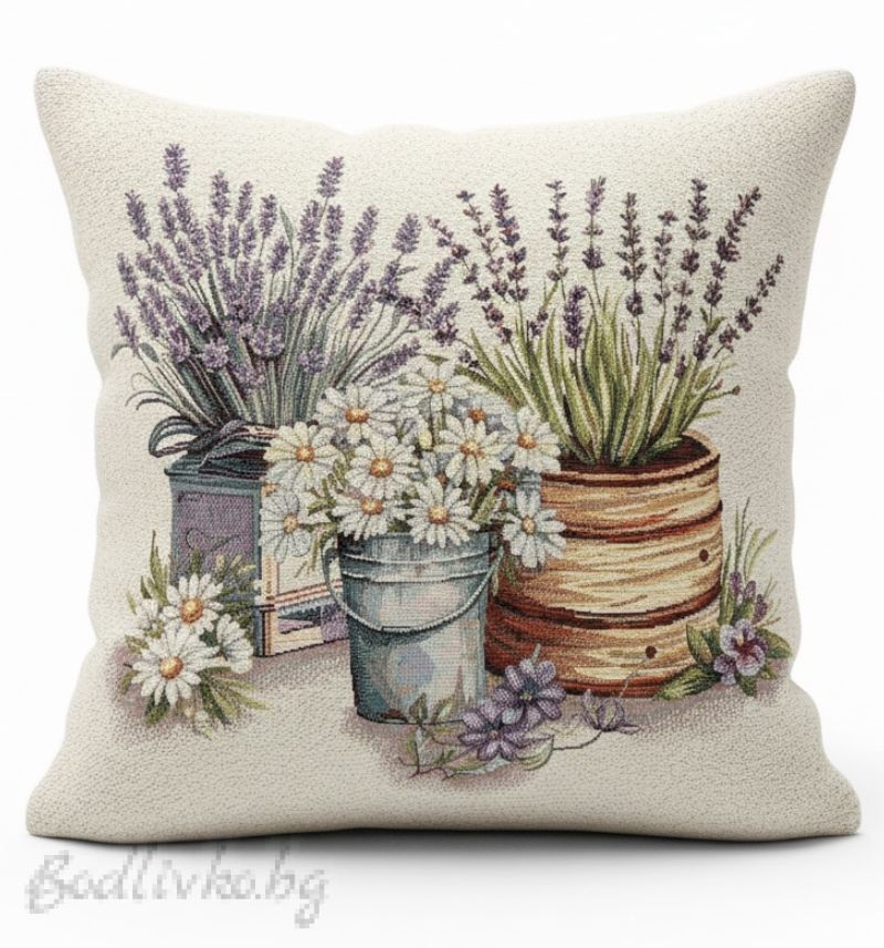 Дизайн и стил: Калъфката е с нежен и стилен дизайн, включващ красива илюстрация на лавандула и маргаритки. Изображението е изпълнено с меки, пастелни тонове, което я прави перфектен акцент за всяка стая. Независимо дали търсите да добавите рустик чар, или да внесете нотка свежест, тази калъфка е идеалният избор.