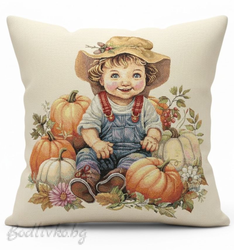 Преобразете всяка стая с тази очарователна калъфка за възглавничка, изобразяваща сладко дете, заобиколено от тикви. С размер 45/45 см, тя е идеалният акцент за вашата спалня, всекидневна или детска стая.