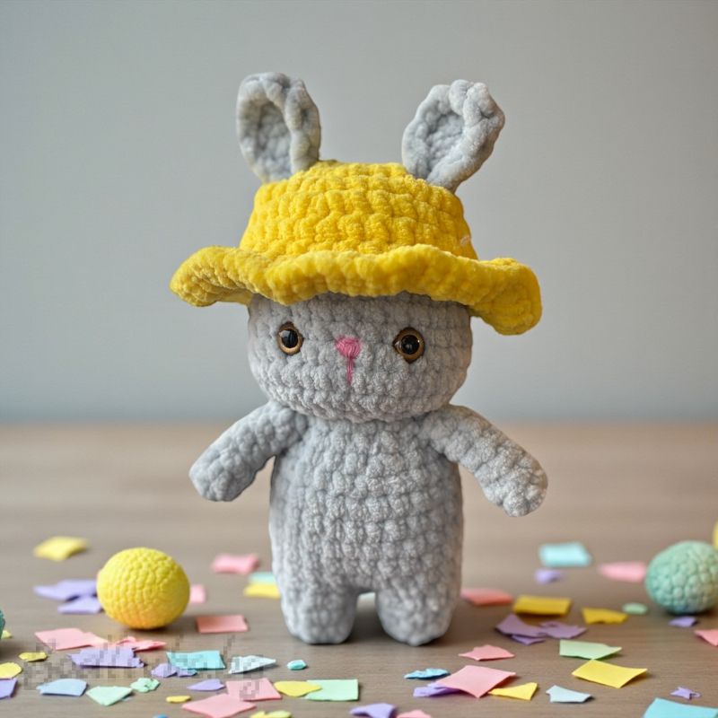 Зайчето е изплетено от 100% мек микрополиестер, който е нежен на допир и безопасен за деца. Плътната плетка гарантира здравина и дълготрайност на играчката, така че тя да може да бъде верен другар за дълго време. Жълтата плетена шапка придава допълнителен чар и стил на това сладко зайче.