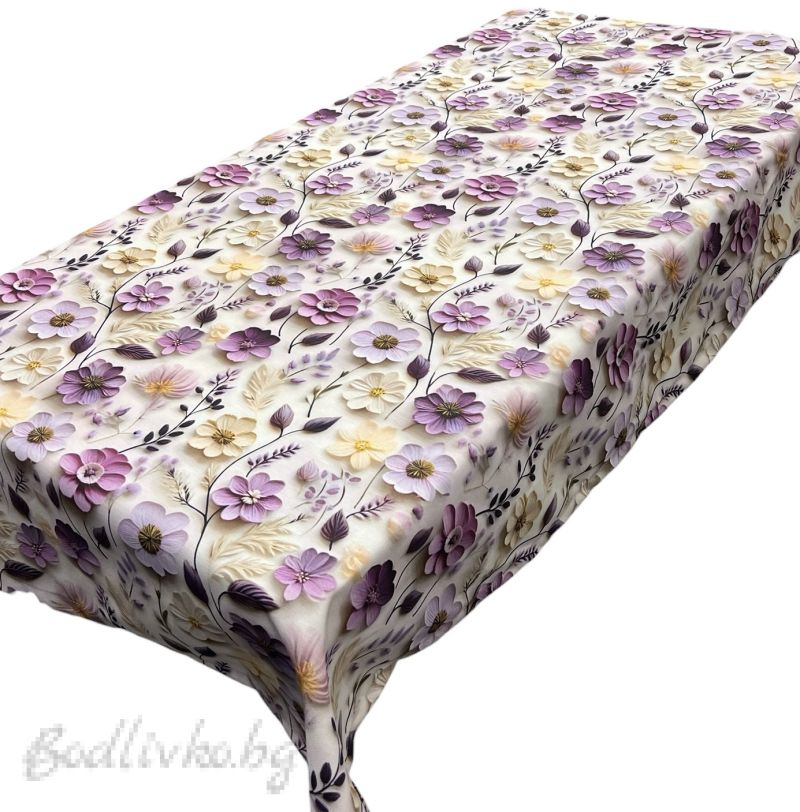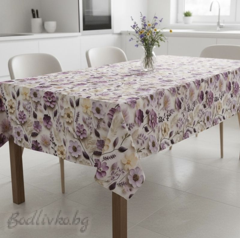 Покривката е украсена с нежни лилави цветя, които придават елегантен и успокояващ вид на вашата трапезария. Цветният дизайн е идеален за всеки повод – от ежедневни семейни вечери до специални събития и празници.