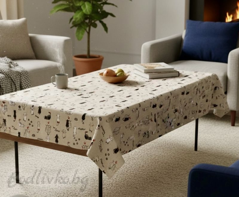 Превърнете трапезата в уютно и закачливо място с тази очарователна покривка с котешки мотиви! Изработена от висококачествен италиански плат Панама, тя е не само красива, но и издръжлива. Размер: Избери по долу: Правоъгълна форма С нежни илюстрации на котки, лапички, сърчица и закачливи надписи в черно, бяло и червено върху светъл фон 🐾❤️