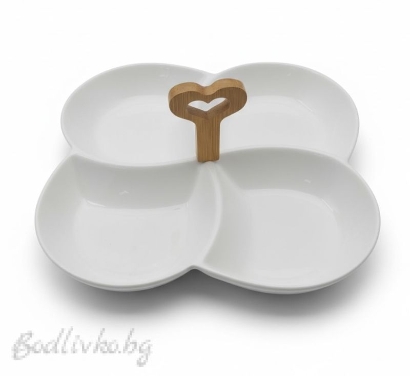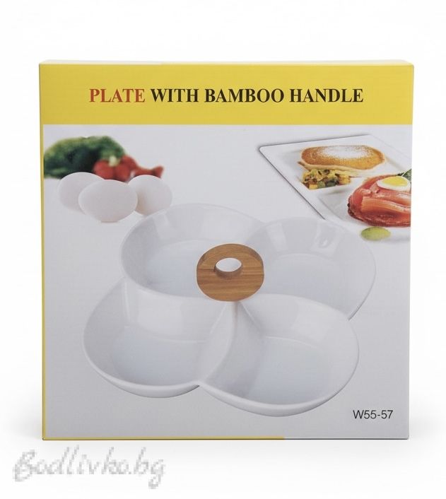 Елегантен ордьовър с диаметър 24 см, изработен от бял порцелан с 4 отделения – идеален за поднасяне на мезета, ядки, плодове или сосове. Акцентът е бамбуковата дръжка, която придава стилен завършек и улеснява сервирането. Подходящ както за ежедневна употреба, така и за празнична трапеза.
