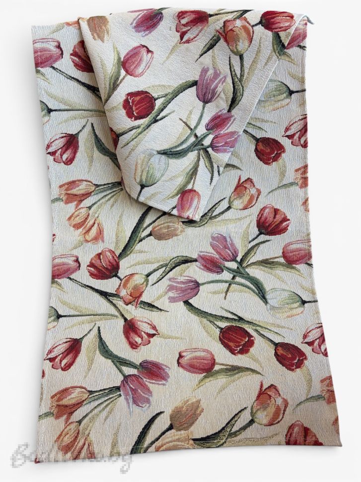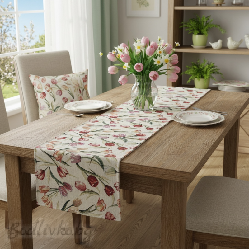 Десенът е изграден от фини, стилизирани лалета, разположени по цялата дължина на плата. Цветовете са меки и хармонични – розово, пудрено, бледо коралово и приглушено бордо, комбинирани с естествени зелени листа и стъбла. Мотивите са разпределени равномерно, без да натоварват визията, което прави тишлайфера подходящ както за ежедневна употреба, така и за по-официална подредба на масата.