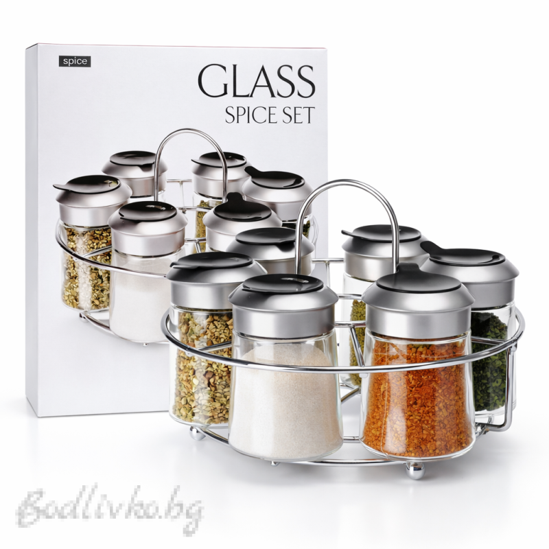 Изработени от прозрачно стъкло, те позволяват лесно разпознаване на съдържанието, без да се налага отваряне. Капачките прилягат плътно и спомагат за запазване на свежестта и аромата за по-дълго време. Практичната кръгла метална поставка осигурява стабилност и спестява място върху кухненския плот или в шкафа, като същевременно придава подреден и елегантен вид.