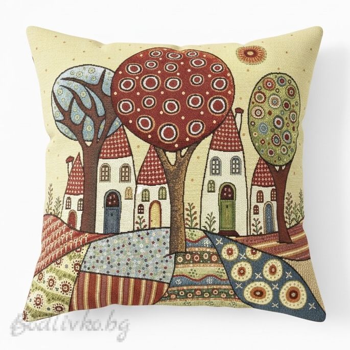 Калъфка „Сред село“ – жакард, 45х45 см Калъфката „Сред село“ е артистичен акцент за дома, вдъхновен от приказна селска атмосфера и изпълнен в богата жакардова тъкан. Десенът представя стилизирани къщички с цветни покриви, декоративни дървета с орнаментирани корони и пъстри хълмове, които създават усещане за топлина, уют и носталгичен чар. Изработена от плътен жакардов плат, калъфката се отличава с висока издръжливост, наситени цветове и фина релефна текстура. Тъканта не е щампована, а изтъкана с мотивите в самата структура на плата, което гарантира дълготрайност на десена и устойчивост при употреба и пране. Размерът 45х45 см я прави универсална и подходяща за стандартни декоративни възглавници. Може да се комбинира както с едноцветни възглавници, така и с други тематични текстили за създаване на уютен кът в хола, спалнята или детската стая. Подходяща е както за класически, така и за по-артистични интериори, където се търси характерен и запомнящ се акцент. Калъфката „Сред село“ носи настроение, цвят и индивидуалност във всяко пространство.