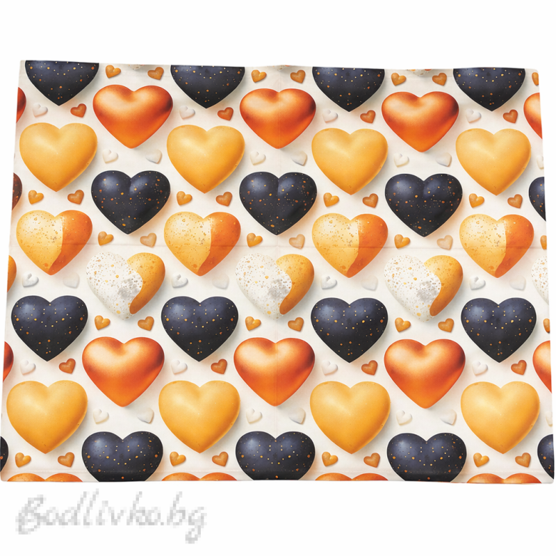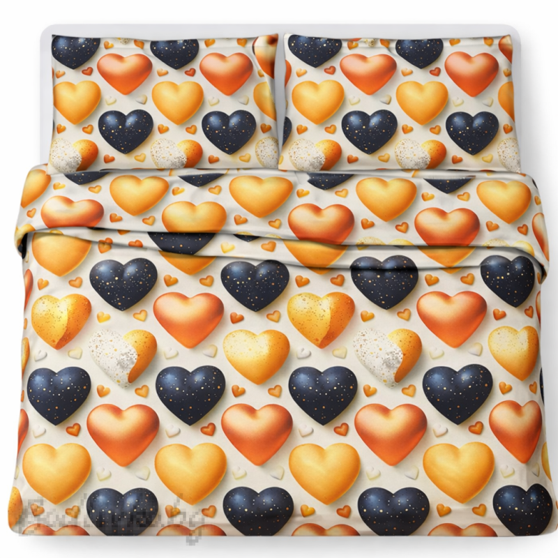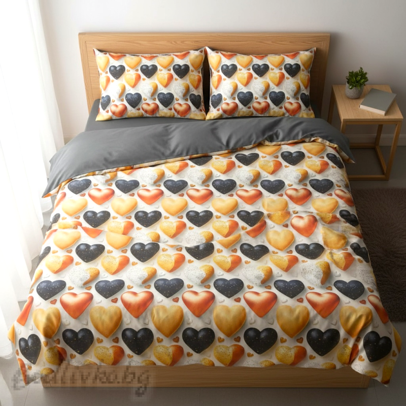 Този спален комплект впечатлява с ефектен 5D десен на сърца, които изглеждат като обемни балони с мек преливащ градиент и фин блясък. Комбинацията от топли оранжево-златисти нюанси и контрастни тъмни сърца създава динамична визия, която придава характер и стил на интериора. Малките декоративни сърца допълват композицията и придават завършен, хармоничен вид.