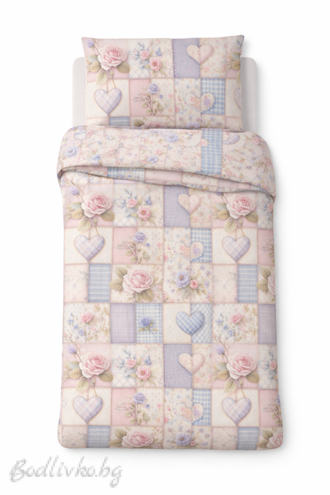 Този комплект впечатлява с фин пачуърк дизайн, съчетаващ деликатни цветя, рози и декоративни сърца в нежни пастелни тонове. Комбинацията от флорални мотиви и каре елементи създава балансирана визия между класически романтичен стил и модерен уют.
