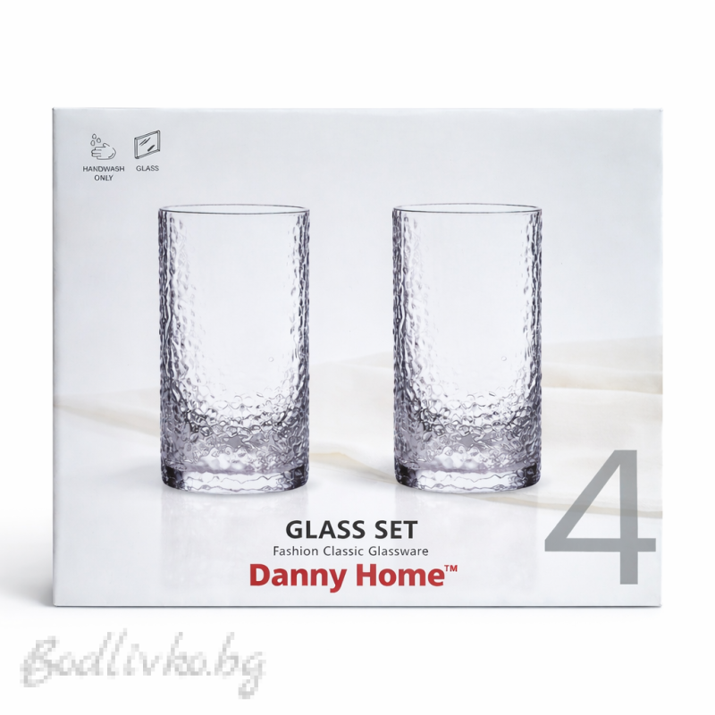 Комплект от 4 броя стъклени чаши Danny Home с вместимост 550 мл, елегантен релефен дизайн и удобна висока форма – подходящи за вода, сок, коктейли и безалкохолни напитки.