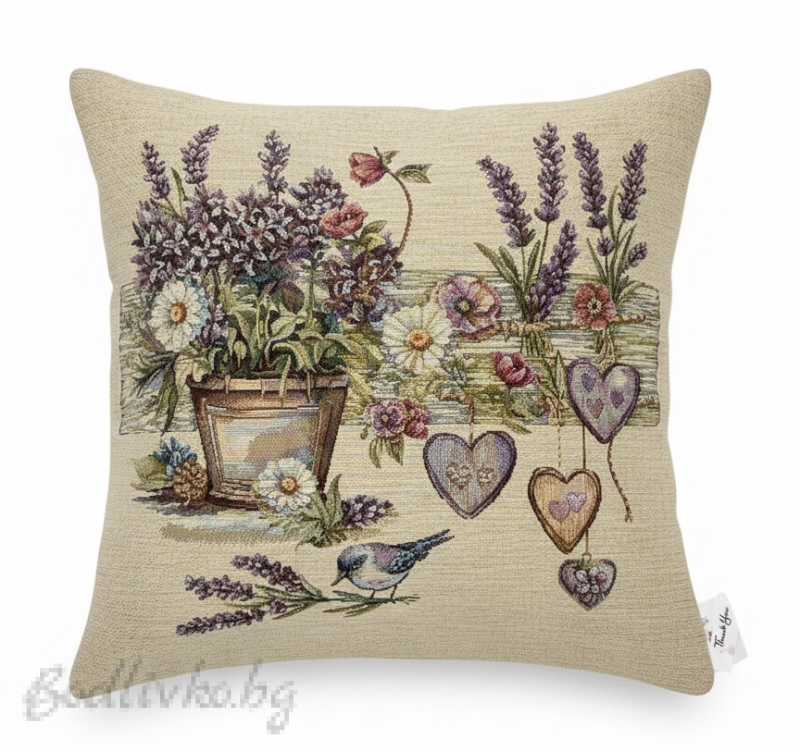 Предимства: * Размер: 45/45 см * Материал: Висококачествени и устойчиви материали * Дизайн: Нежни мотиви на лавандула и цветя * Поддръжка: Лесна за почистване и пране в пералня * Приложение: Идеална за декорация на всяка стая