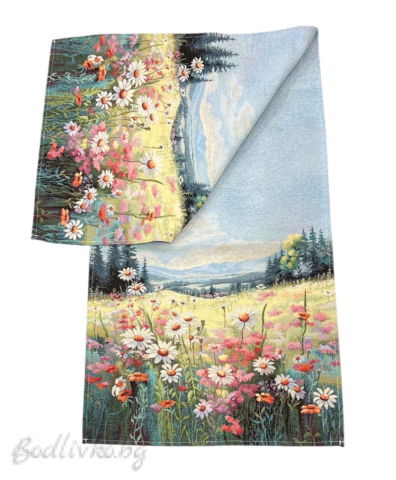Жакардовият тишлайфер с размер 45/140 см впечатлява с изключително красив пейзажен дизайн, изобразяващ цветна лятна поляна с маргаритки, диви цветя и живописна гледка към планини и синьо небе. Детайлите са изтъкани в самата материя, което придава дълбочина, релеф и усещане за истинска гобленова картина.