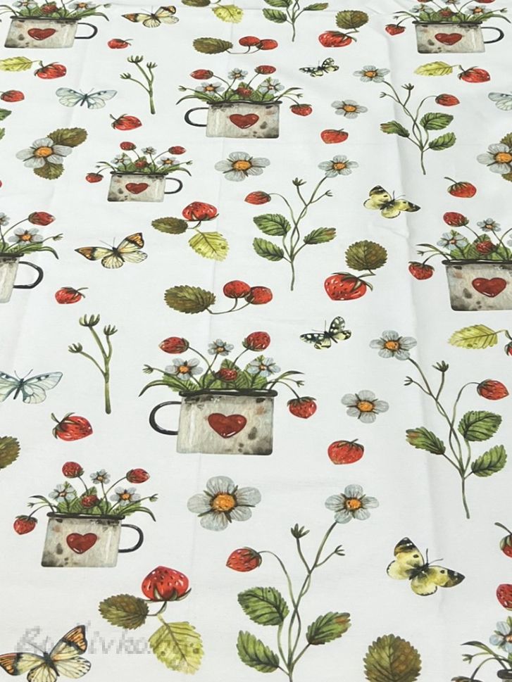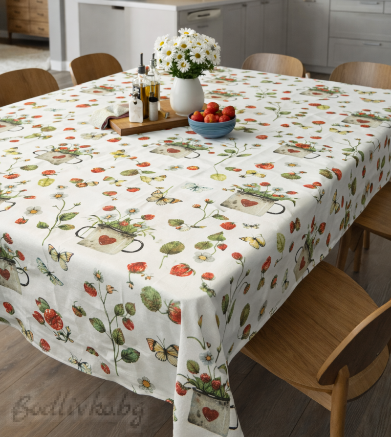 Десенът е свеж и детайлен – сочни червени ягоди, нежни полски цветя, пеперуди и декоративни мотиви върху светъл фон, които създават уютна и топла атмосфера в дома. Идеална е както за ежедневна употреба, така и за специални поводи, пролетни и летни събирания, както и за използване на открито.