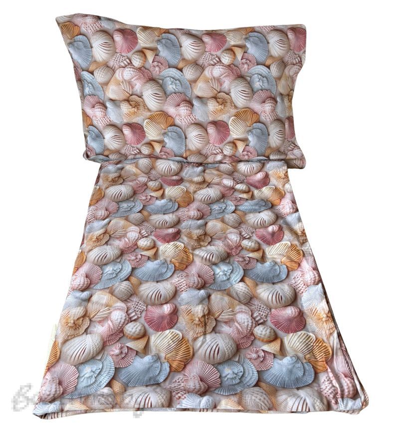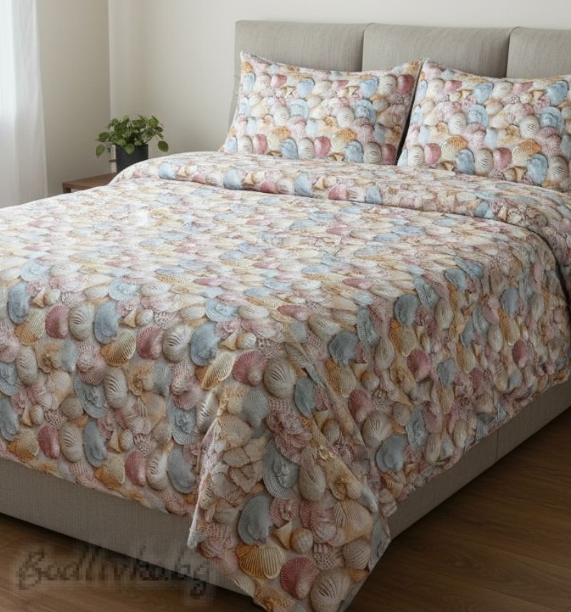 Този комплект спално бельо с десен морски мидички създава усещане за спокойствие, лято и морски бриз. Дизайнът комбинира нежни пастелни нюанси – розово, светлосиньо, бежово и кремаво, които хармонично се съчетават и придават лекота на интериора.
