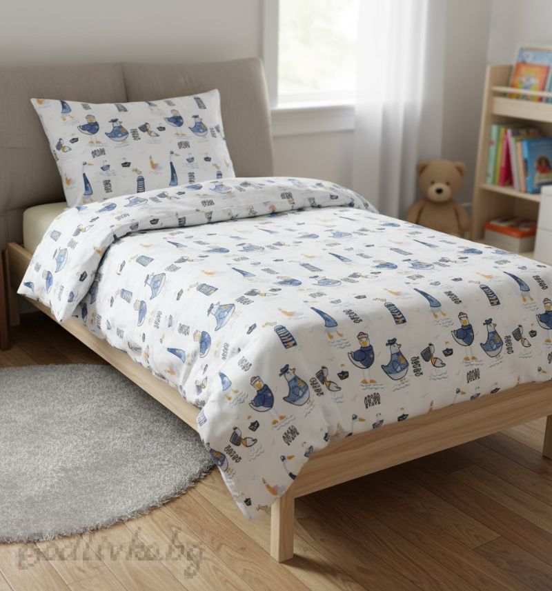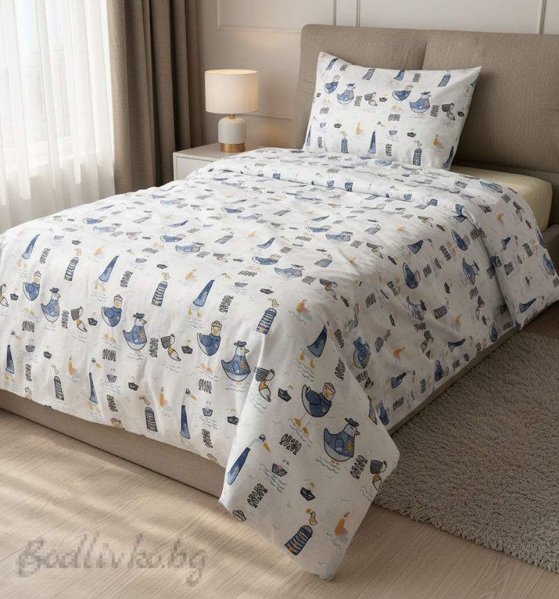 Спален комплект за единично легло, Сини птици абстракт- 100% памук (Ранфорс), 3 части
