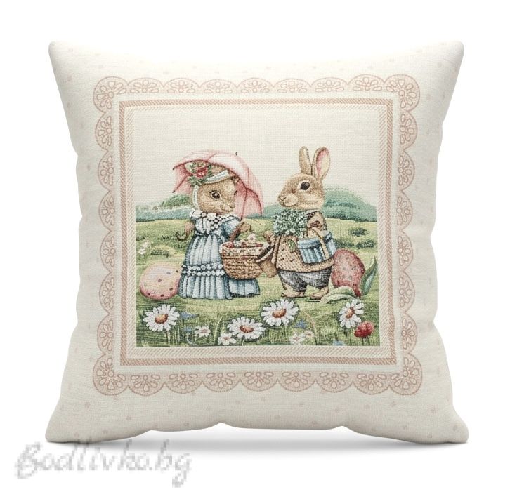 Жакардова калъфка за възглавница „Семейство великденски зайчета на поляна“