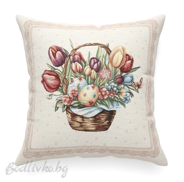 Жакардова калъфка за възглавница „Великденски букет в кошничка“