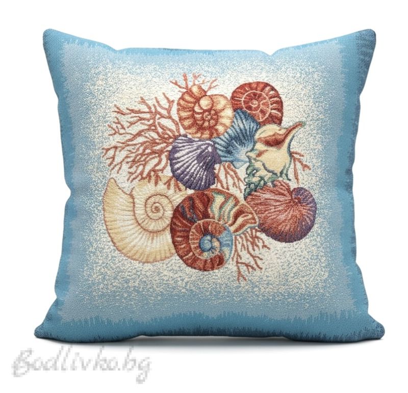 Жакардовата калъфка за възглавница „Морски охлюви“ с размер 45х45 см е стилен акцент за интериори с морска или лятна тематика. Дизайнът представя композиция от красиви морски миди, охлюви и корали, подредени в хармонична цветова палитра от тюркоазено, пясъчно, коралово и бяло. Фонът с преливащ ефект в синьо придава усещане за морски бриз и спокойствие.