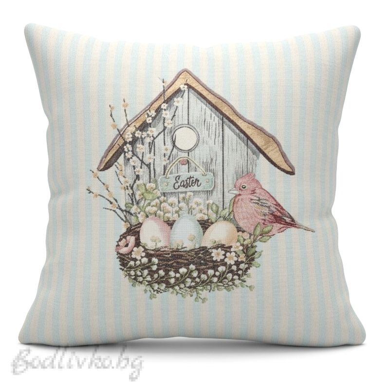 Жакардова калъфка за възглавница „Къщичка за пиленце с великденски яйца“