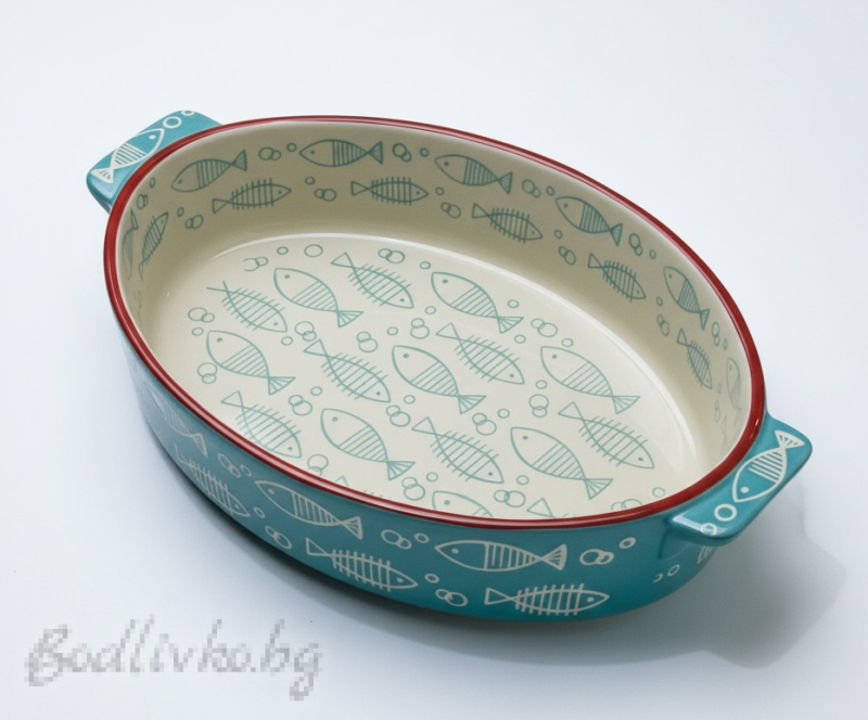 Елипсовидният дизайн и декоративният морски мотив придават стилен завършек, а удобните странични дръжки осигуряват стабилен захват при изваждане от фурната. Подходяща е както за готвене, така и за елегантно сервиране директно на трапезата.