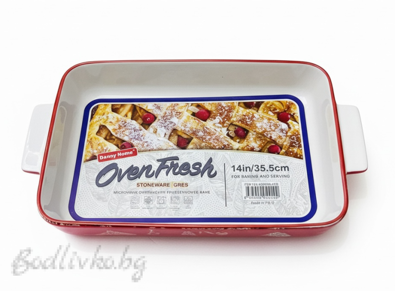 Керамичната правоъгълна тава Danny Home с дължина 35,5 см (включително дръжките) и дълбочина 6 см е просторен и практичен съд за печене, подходящ за семейни порции и по-големи ястия. Идеална е за приготвяне на лазаня, мусака, печени зеленчуци, месо, сладкиши и различни запеканки.
