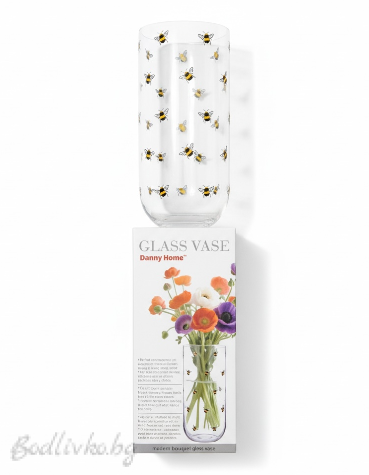 Стъклената ваза Danny Home (25 см) впечатлява с изчистена форма и фин декоративен мотив с пчели, който придава свежест и характер. Изработена от прозрачно, качествено стъкло, тя подчертава естествената красота на цветята и позволява лесно съчетаване с различни интериорни стилове – от скандинавски до рустик. Подходяща е за ежедневна употреба, декорация на трапезна маса, хол, офис или като стилен подарък.