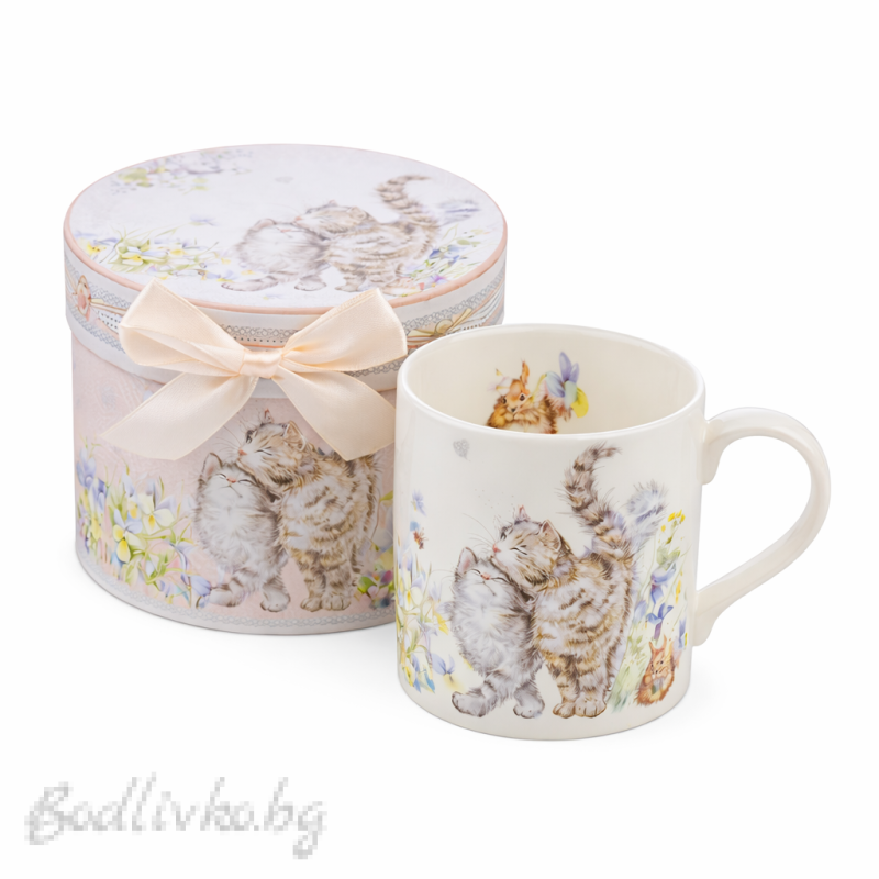Очарователна порцеланова чаша за кафе или чай с нежен дизайн на сладки котенца, заобиколени от деликатни цветя. Илюстрацията носи топлина и уют, превръщайки всяка пауза в истинско удоволствие.