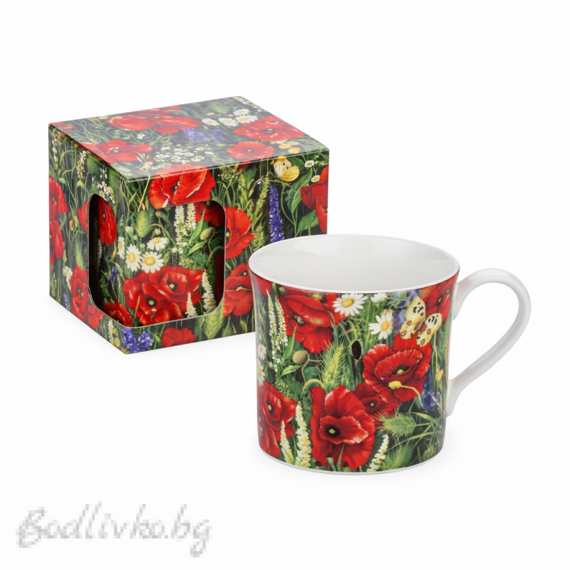Елегантна порцеланова чаша за кафе или чай, изработена от фин костен порцелан, който се отличава с лекота, здравина и изискан блясък. Декорирана с красиви червени макове и полски цветя, тя носи усещане за свежест, природа и топлина във всеки дом.